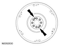 - Install 2 of the removed flywheel bolts in the 2 holes shown on the flywheel flange.
