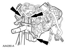 38. Remove the 2 bolts and the wiring harness retaining bracket.