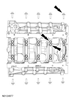12. Tighten the 10 new outside vertical main bearing cap fasteners in the sequence shown, in 3 stages.