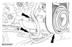 9. Position the Supercharger (SC) drive onto the A/C compressor and attach the 2 wiring harness retainers onto the A/C compressor stud bolts.