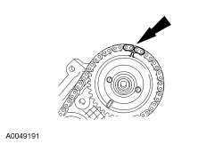 11. Install the LH timing chain on the camshaft sprocket, aligning the 2 colored links with the timing mark on the sprocket.