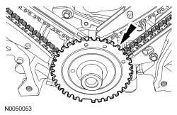 15. Position the RH (outer) timing chain on the crankshaft sprocket, aligning the colored link with the timing marks on the sprocket.