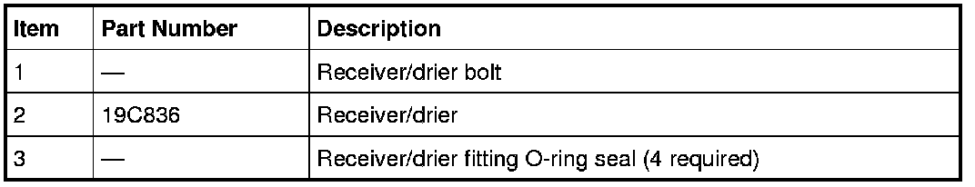 NOTE: Installation of a new receiver/drier is not required when repairing the A/C system, except when there is physical evidence of contamination from a failed A/C compressor or damage to the receiver/drier. Damage to the receiver/drier includes leaks in the receiver/drier, physical damage to the receiver/drier shell or desiccant, or moisture contamination. Moisture contamination results only from a complete loss of refrigerant and equalization of the refrigerant system pressure with atmospheric pressure for a period longer than one hour. If even a slight amount of positive refrigerant pressure is present in the system before repairs are carried out, the receiver/drier should not be replaced.