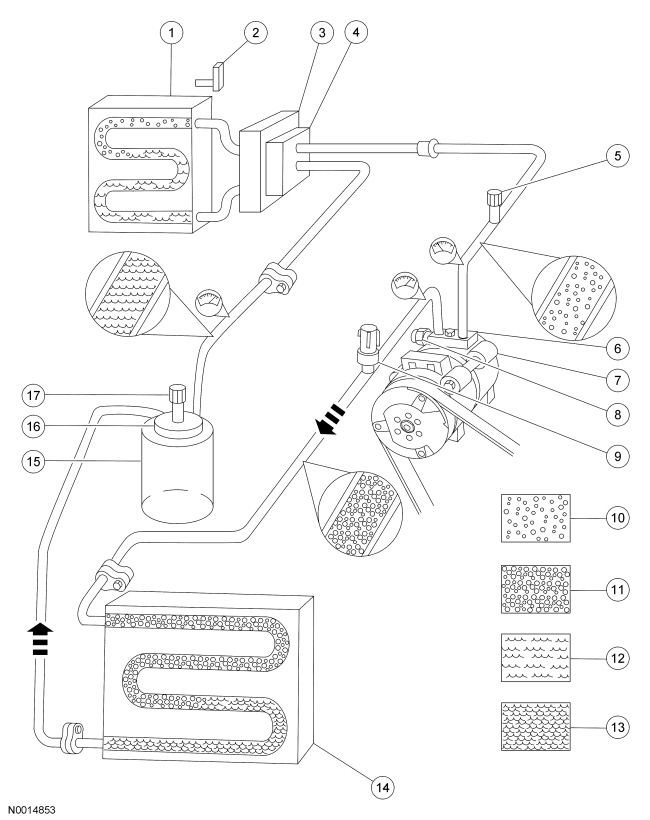 The A/C condenser, being close to ambient temperature, causes the refrigerant vapor to condense into a liquid when heat is removed from the refrigerant by ambient air passing over the fins and tubing. The now liquid refrigerant, still at high pressure, exits from the bottom of the A/C condenser and enters the inlet side of the A/C receiver/drier. The receiver/drier is designed to remove moisture from the refrigerant.