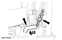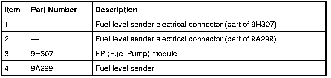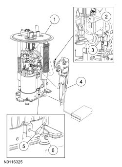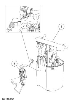 4. Depress the lock tab and remove the fuel level sender from the FP (Fuel Pump) module.