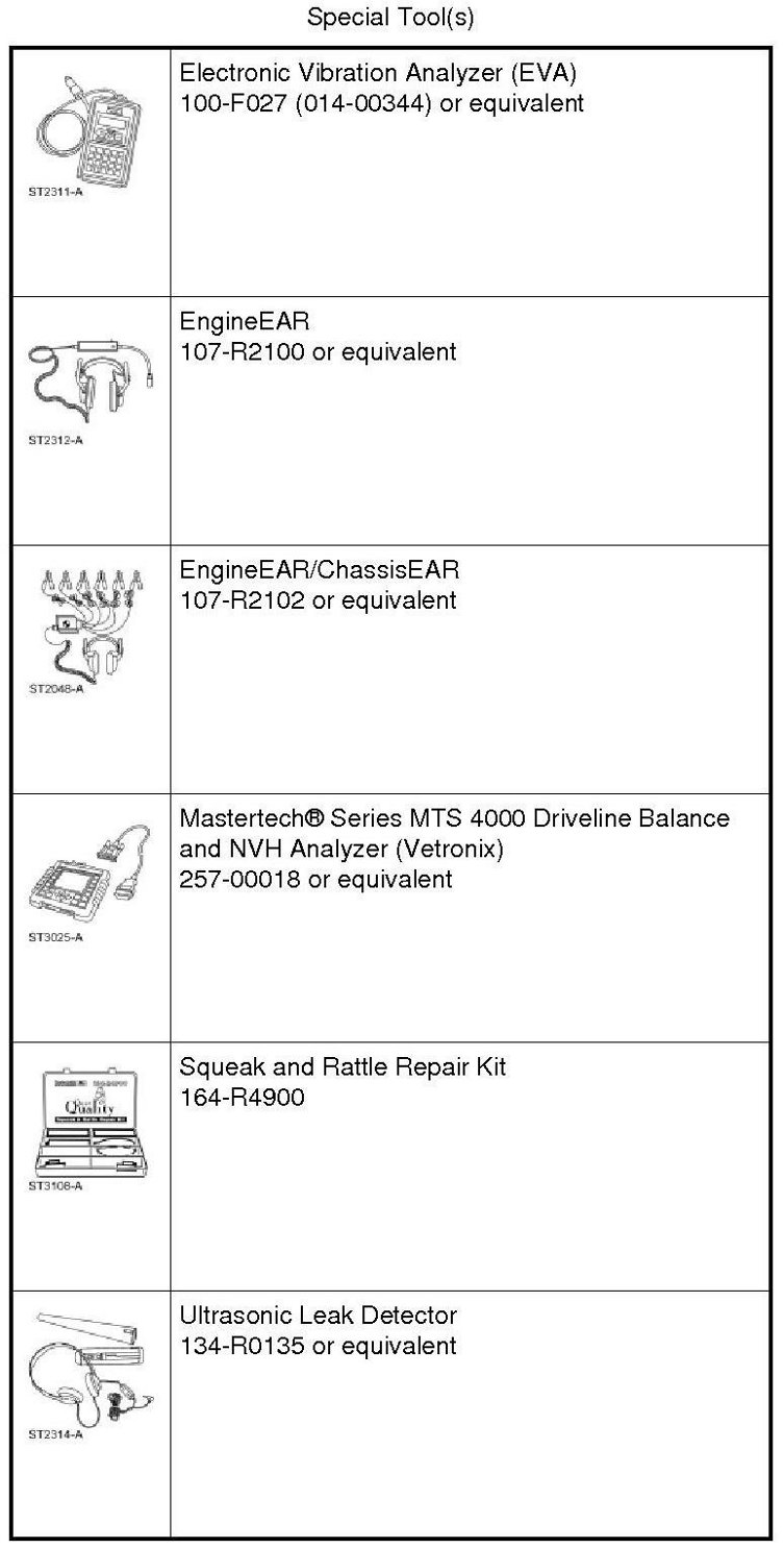 The following diagnostic tools and techniques can be used separately or in conjunction with each other to aid in the diagnosis of NVH symptoms. They are listed in order of preference for ease in their use for locating these symptoms.