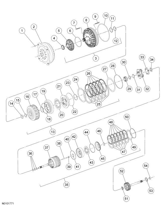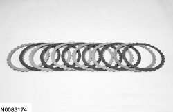 25. Install the low/reverse clutch plates, starting with the pressure plate and alternating between the friction and steel plates and ending with the wave spring plate on the top.