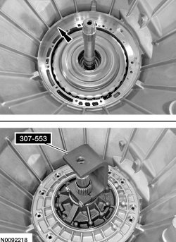 48. Lubricate the transmission case pump bore with petroleum jelly. Using the Transmission Fluid Pump Remover, position the pump assembly in the case and rotate the pump to insert the pump splines into the front planetary sun gear. Rotate the pump to align the pump-to-case bolts and push the pump into the case.