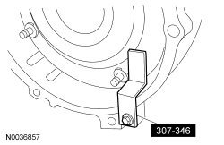 36. Install the transmission fluid cooler bracket and nut to the flexplate inspection cover stud bolt.
