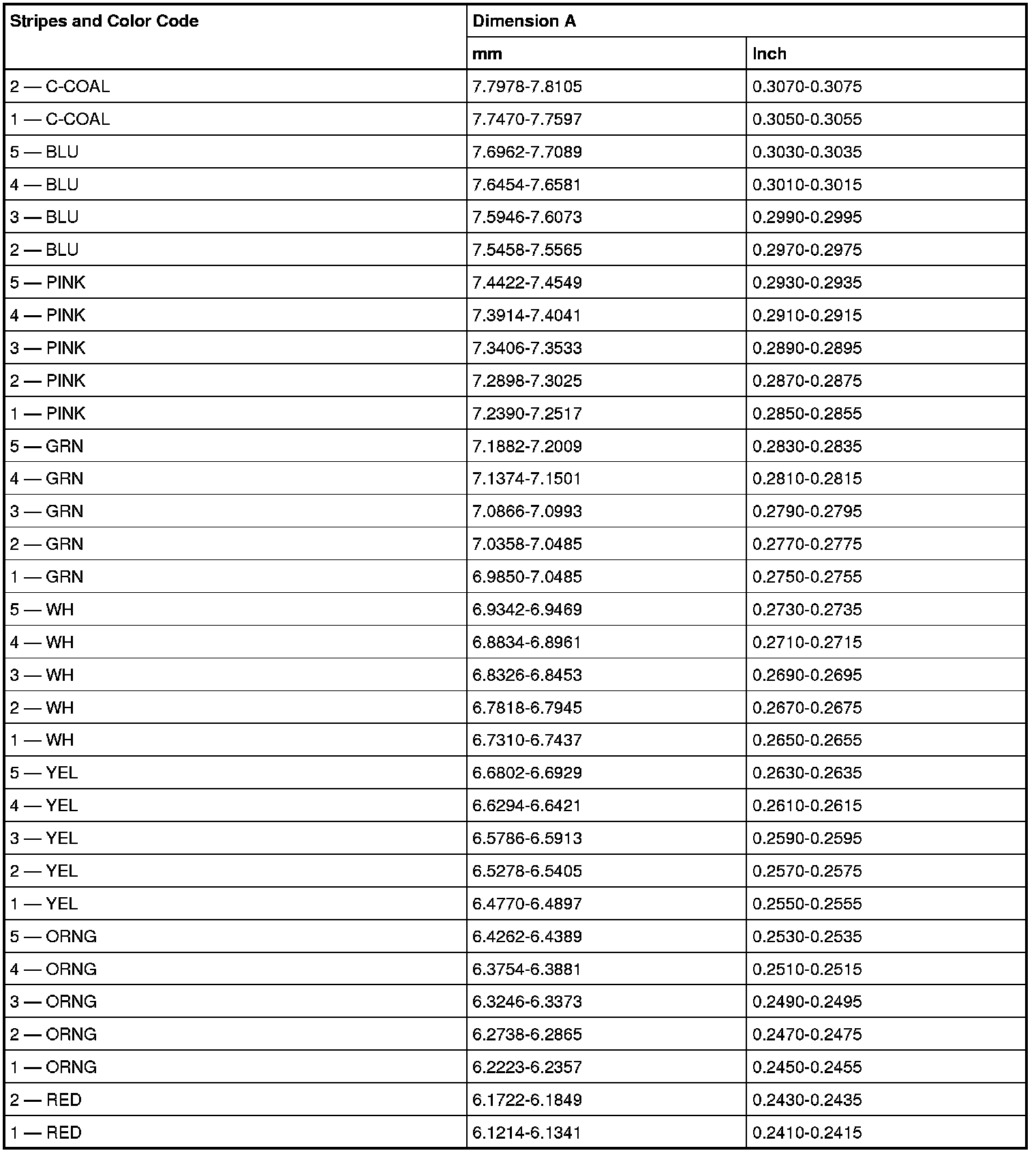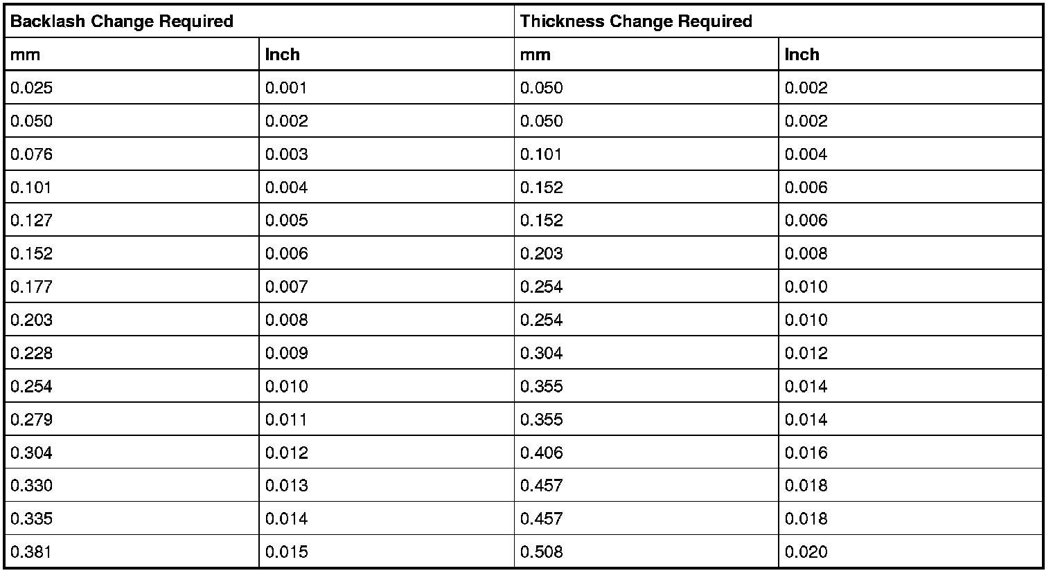 6. To correct for high or low backlash, increase the thickness of one differential bearing shim and decrease the thickness of the other differential bearing shim by the same amount. Refer to the following tables when adjusting the backlash.