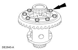 16. Position the differential ring gear and the differential case. Align the bolt holes by starting 2 new bolts through the holes in the differential case and the differential ring gear. Press the differential ring gear on the differential case.