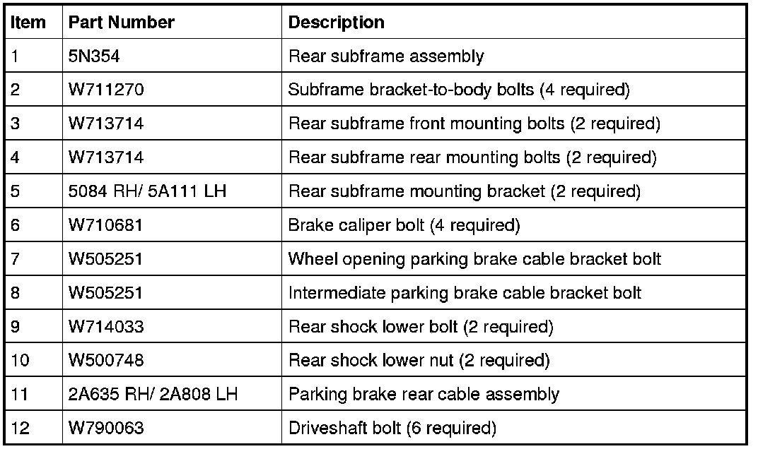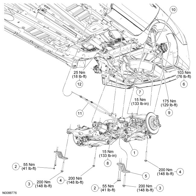 15. Remove the 4 subframe bracket-to-body bolts. Discard the bolts.
