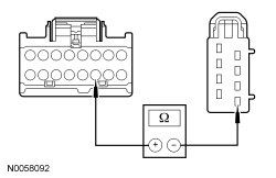 - Measure the resistance between DCSM (Dual Climate Controlled Seat Module) C3265C-16, circuit CHS03 (GN/BN), harness side and ground.