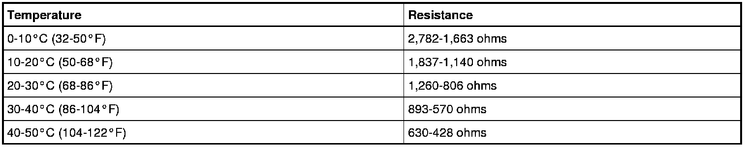 - Measure the resistance between DCSM (Dual Climate Controlled Seat Module) C3265B-4, circuit VHS36 (YE/BU), harness side and C3305B-5 circuit RHS20 (GN/BU), harness side. Note the ambient temperature and refer to the following table.