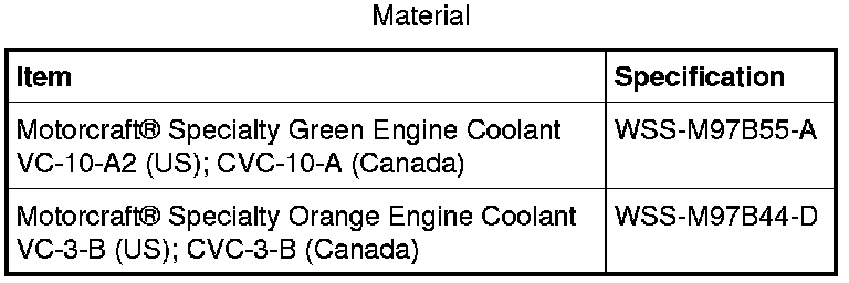 NOTICE: The engine cooling system is filled with Motorcraft(R) Specialty Green Engine Coolant or Motorcraft(R) Specialty Orange Engine Coolant. Always fill the cooling system with the manufacturer's specified coolant. Chemically flush the cooling system if a non-specified coolant has been used. Refer to Cooling System Flushing . Failure to follow these instructions may damage the engine or cooling system.