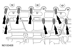 NOTICE: During engine repair procedures, cleanliness is extremely important. Any foreign material, including any material created while cleaning gasket surfaces that enters the oil passages, coolant passages or the oil pan, may cause engine failure.