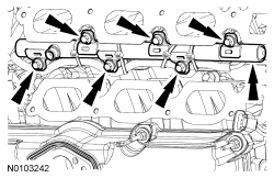 Install the 6 bolts and the LH fuel rail assembly.