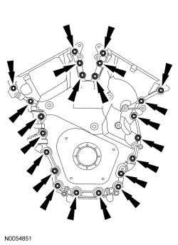 - Stage 2: Tighten bolts 1 thru 22 to 24 Nm (18 lb-ft) and bolts 23, 24 and 25 to 75 Nm (55 lb-ft).