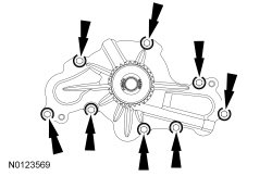Install a new gasket, the coolant pump and the 8 bolts. Tighten in the sequence shown in 2 stages: