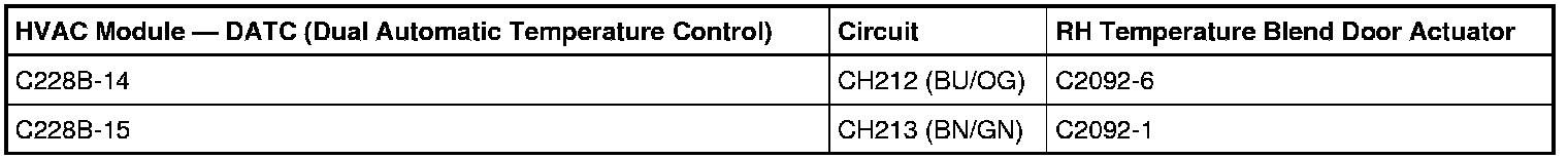 For DTC B1082:00, measure the resistance between HVAC module- DATC (Dual Automatic Temperature Control) C228B, harness side and RH temperature blend door actuator C2092, harness side using the following chart: