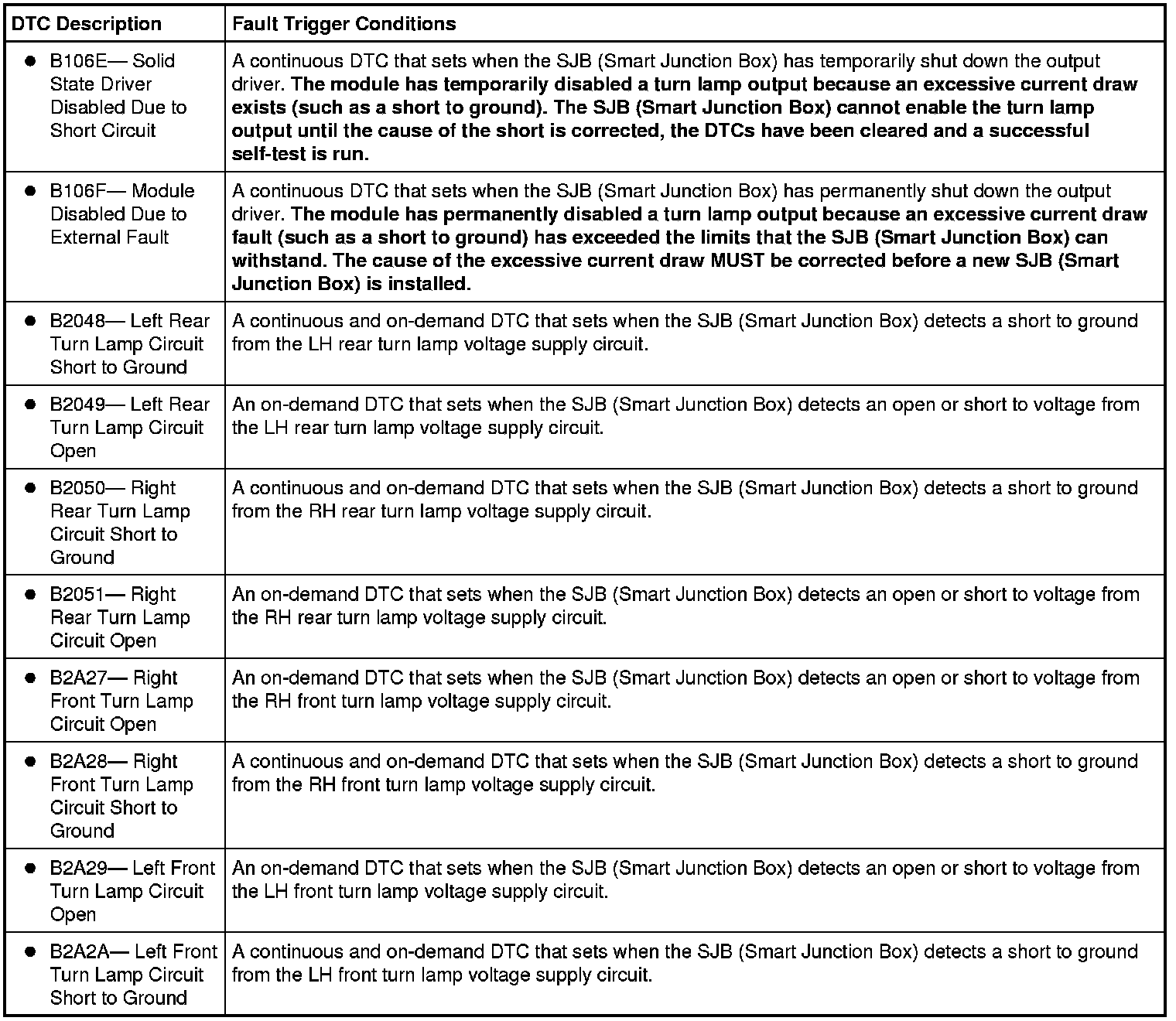 When the SJB (Smart Junction Box) detects the multifunction switch in the LH or RH TURN position, the SJB (Smart Junction Box) sends voltage to the appropriate turn lamps.