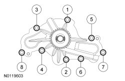 Install a new gasket, the coolant pump and the 8 bolts. Tighten in the sequence shown in 2 stages: