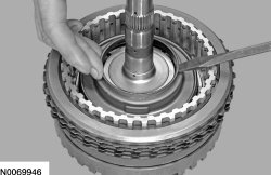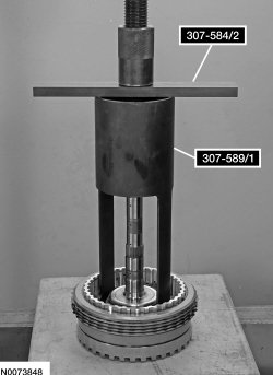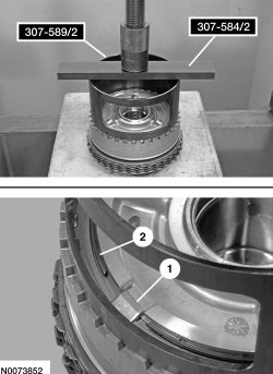 Install the Overdrive Clutch, Balance Piston and Direct Clutch Compressor 307-589/2 and the Forward/Intermediate Spring Compressor 307-584/2 on the direct clutch cylinder. Using a press, compress the direct clutch piston return spring, and remove the snap ring.