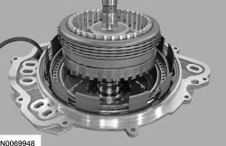 102. Remove the direct clutch cylinder. Position the overdrive/direct clutch assembly in the cover assembly. Apply 483 kPa (70.05 psi) of air pressure to the direct clutch piston port to remove the direct clutch cylinder from the overdrive/direct clutch assembly. Remove the overdrive/direct clutch assembly from the rear cover and remove the direct clutch cylinder.