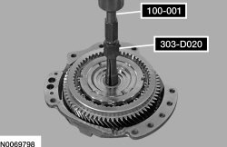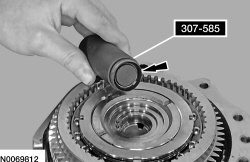Install the Forward/Intermediate Spring Compressor 307-584/1 and 307-584/2. Using a press, compress the intermediate clutch piston return spring, install the snap ring and remove the Forward/Intermediate Spring Compressor 307-584/1 and 307-584/2.