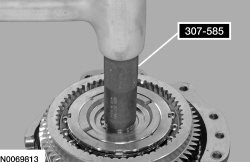 Compress the low/reverse piston return spring, install the snap ring and remove the Forward/Intermediate Spring Compressor 307-584/2 and the Reverse Clutch Piston and Retaining Ring Set 307-588/3.