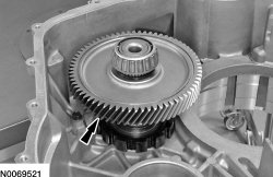 202. Tilt the transfer shaft and gear assembly over and install the differential assembly.