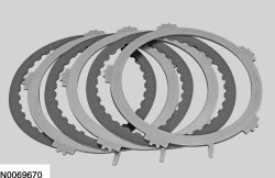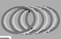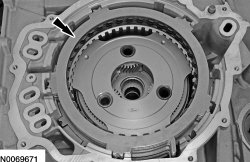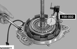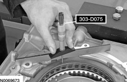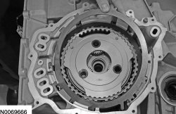 268. Position the Dial Indicator Gauge with Holding Fixture 100-002 on the direct clutch pressure plate. Apply 483 kPa (70 psi) of air pressure to the direct clutch piston port while recording the clutch pack clearance on the Dial Indicator Gauge. The clearance should be between 0.98 mm (0.038 in) and 2.34 mm (0.092 in). If the clearance is out of range, check the direct clutch pack for correct installation. If the direct clutch pack is correctly installed, install a new direct clutch pack.