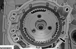 267. Position the overdrive/direct clutch assembly in the cover assembly, install the Dial Indicator Gauge with Holding Fixture 100-002 or a dial indicator and position the plunger on the overdrive clutch pressure plate. Apply 483 kPa (70 psi) of air pressure to the overdrive clutch piston port while recording the clutch pack clearance on the Dial Indicator Gauge. The clearance should be between 1.13 mm (0.044 in) and 2.28 mm (0.089 in). If the clearance is out of range, check the overdrive clutch pack for correct installation. If the overdrive clutch pack is correctly installed, install a new overdrive clutch pack.