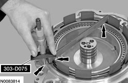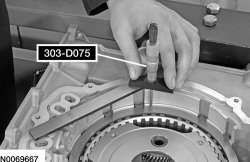 261. Using a straightedge and the Depth Micrometer 303-D075, measure and record as measurement A, the distance from the transaxle case deck surface to a low point on the intermediate clutch wave spring.