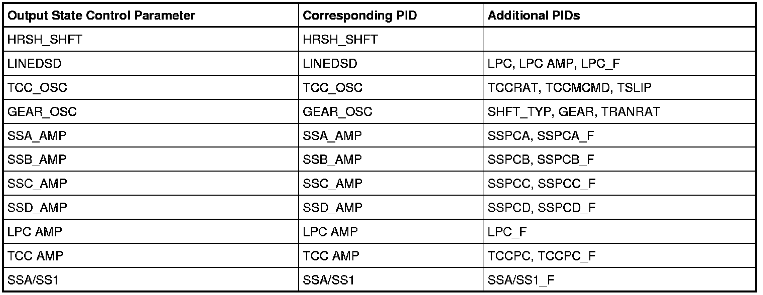 To confirm that the output state control value was sent by the scan tool and the PCM has accepted the output state control command, a corresponding PID for each output state control parameter must be monitored. After sending the output state control value, the corresponding PID value should be the same as the output state control value that was sent. Additional PIDs are listed that may be monitored to help the technician accurately diagnose the transaxle.