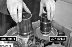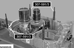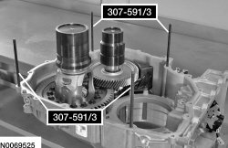 2. Install the Differential/Transfer Gear Bearing Shim Gauge 307-591 (307-591/1 and 307-591/2) on the differential and transfer shaft bearing cups.