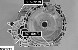 4. NOTE: Make sure that the silicone has been cleaned off the machined surface of the transaxle case and the torque converter housing before installing the Differential/Transfer Gear Bearing Shim Gauge 307-591/3 (4 spacers) or the preload measurement may be inaccurate.