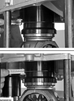 9. Using a feeler gauge, measure and record the smallest and largest preload gap on the Differential/Transfer Gear Bearing Shim Gauge 307-591/1 placed on the differential assembly. Add the 2 measurements and divide by 2. This is the thickness of the differential bearing preload shim. For additional information, refer to Specifications for the differential bearing preload shim part number.