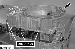 3. Install the Differential/Transfer Gear Bearing Shim Gauge 307-591/3 (studs) in the transaxle case to align the torque converter housing.
