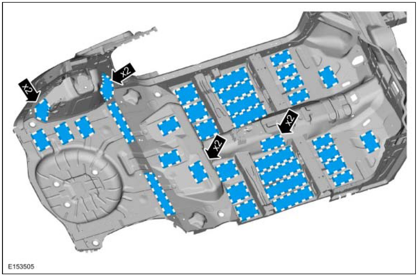 The following serve as a reference to indicate mastic patch (butyl) locations. Additional insulators and sound deadeners are used beyond those indicated in the illustrations.