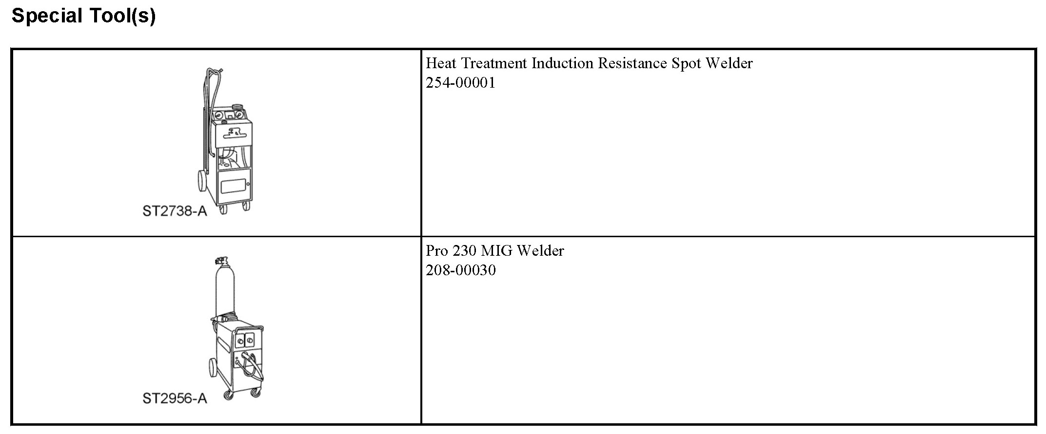 1. NOTE: Factory spot welds may be substituted with either resistance spot welds or MIG plug welds. Spot/plug welds should equal factory welds in both location and quantity. Do not place a new spot weld directly over an original weld location. Plug weld hole should equal 8 mm (0.31 in) diameter.