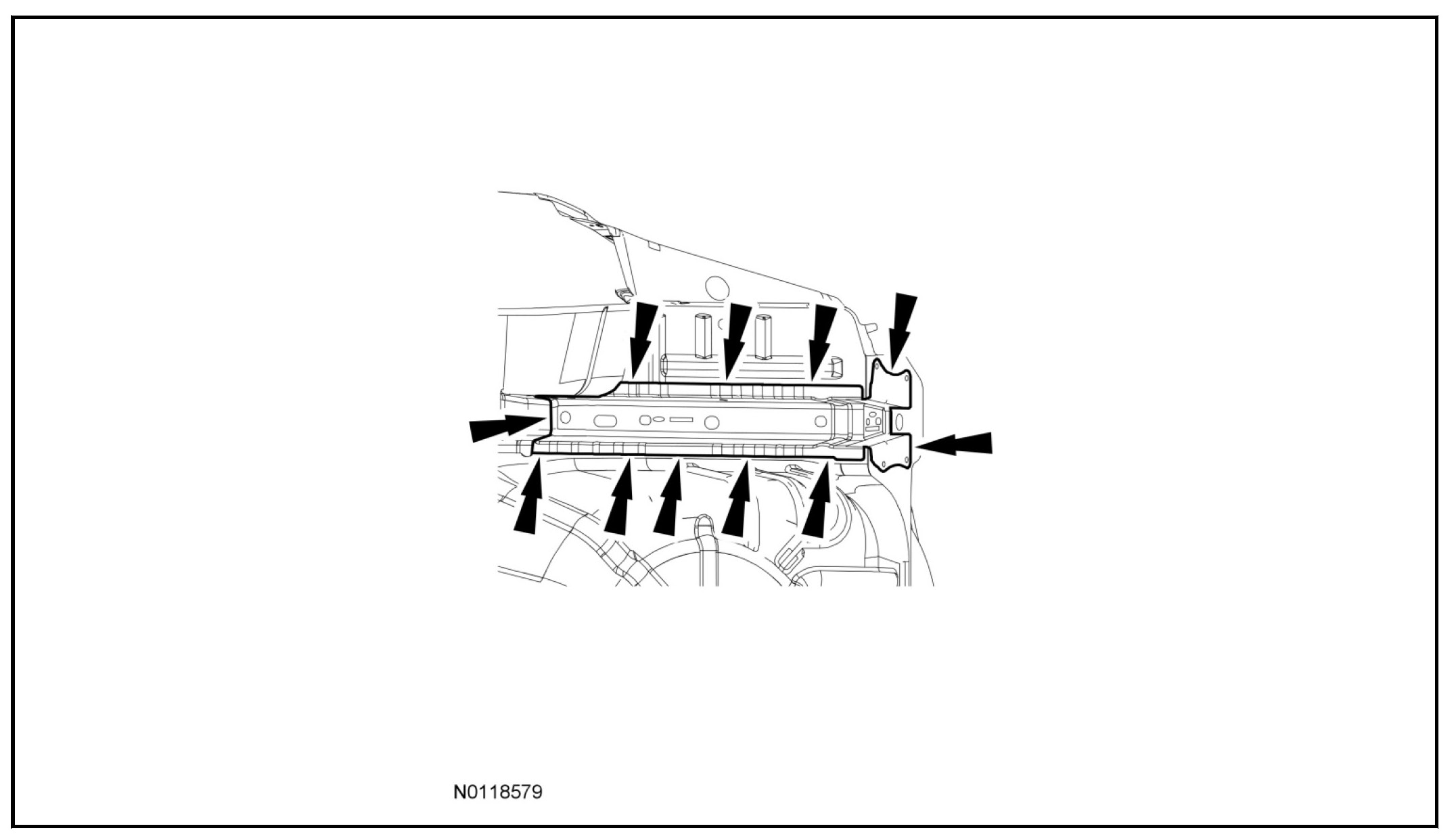 NOTICE: Because of component composition (Dual Phase Steel (DP) 600 steel) a frame rail sectioning kit is not available for this vehicle. Frame rail replacement must be carried out by replacement at the factory seams.