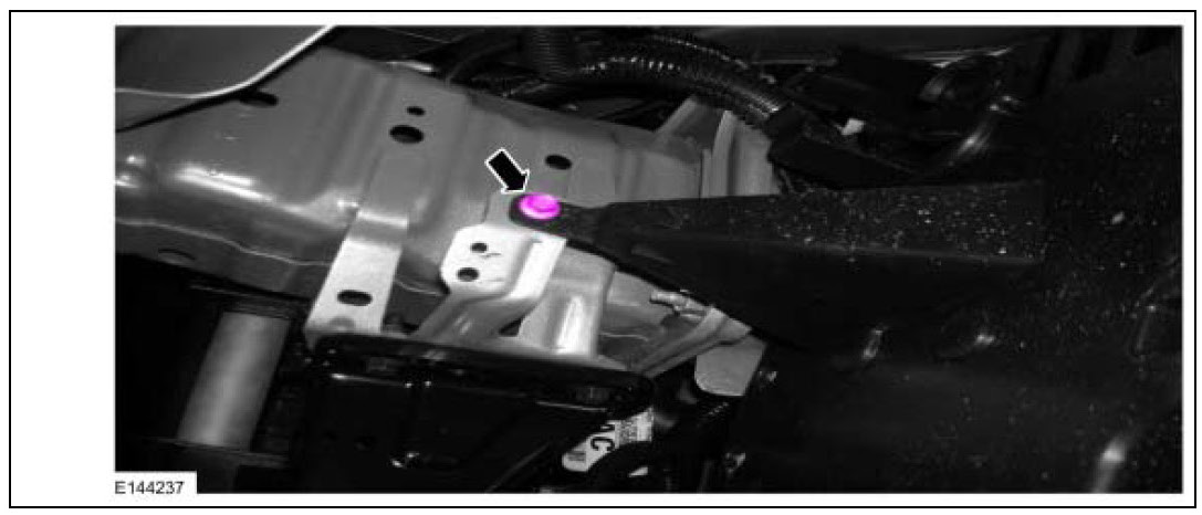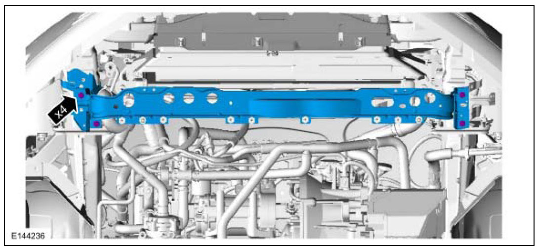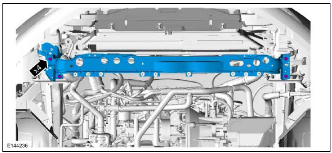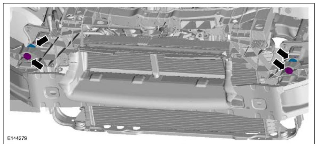 13. Loosen as far as possible but do not remove the upper radiator grille reinforcement bolts.