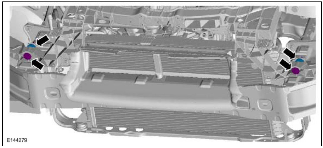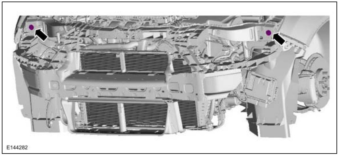 15. Loosen as far as possible but do not remove the upper radiator grille reinforcement bolts.