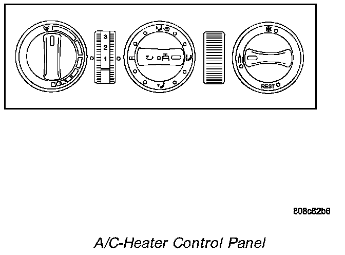 The A/C-heater control panel is located on the instrument panel inboard of the steering column and below the radio. The A/C-heater control panel contains a rotary-type temperature control knob, a rotary-type mode control knob, a thumbwheel-type blower motor speed control and an air conditioning compressor push button switch and indicator lamp. The A/C-heater control panel also features a push button switch and indicator lamp for the residual engine heat utilization (REST) function, cabin heater or the heater booster (as equipped).