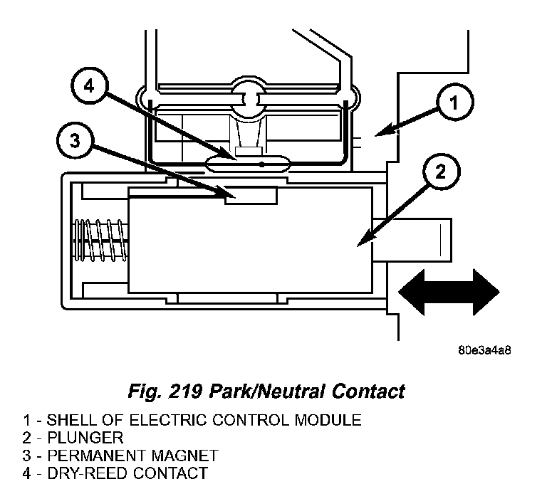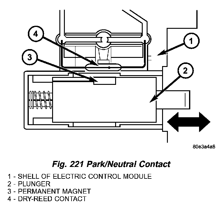 In selector lever positions "P" and "N" the park/ neutral contact (4) (Fig. 221) is actuated by a cam track which is located on the detent plate. The permanent magnet (3) is moved away from the dry-reed contact (4). The dry-reed contact (4) is opened. The TCM receives an electric signal. The circuit to the starter in the selector lever positions "P" and "N" is closed.