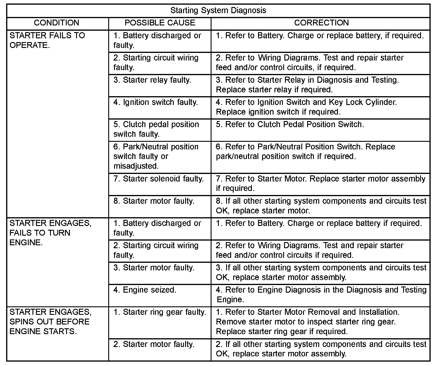 For complete starter wiring circuit diagrams, refer to Wiring Diagrams. The battery must be fully-charged and load-tested before proceeding. Refer to Battery.