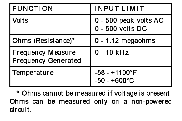 - Voltage between any terminal and ground must not exceed 500v DC or 500v peak AC.