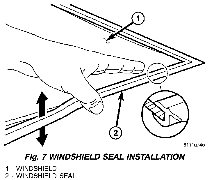 2. Position windshield seal onto windshield starting at one corner and quickly moving up and down. (Fig. 7)