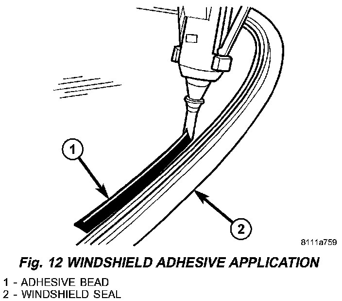 1. Apply bead of glue with a triangular nozzle directly to the windshield seal starting at bottom in center of windshield. (Fig. 12)